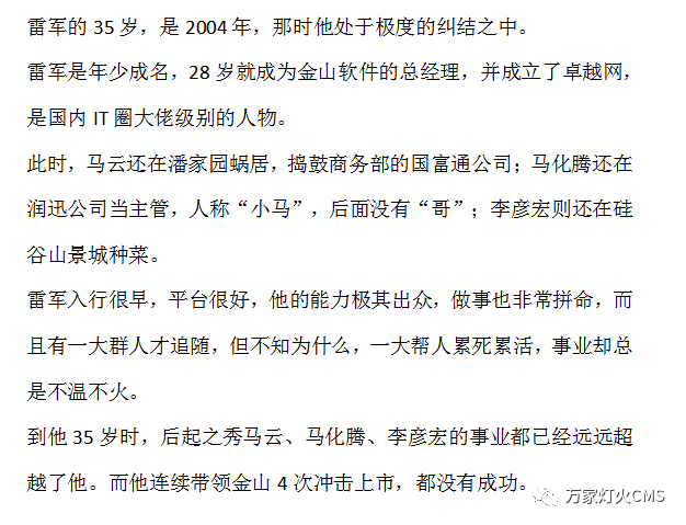 雷軍35歲雖然已經(jīng)是金山總經(jīng)理和卓越董事長,但是做得又累又焦慮又迷茫,直到41歲創(chuàng)立小米,才開始一飛沖天;