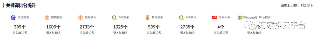 2.關(guān)鍵詞上詞數(shù):10218個,各個營銷渠道相關(guān)關(guān)鍵詞均在百度搜索、百度移動、搜狗搜索、搜狗移動、360搜索、360移動、神馬搜索、*頭條、Bing搜索等搜索引擎平臺占據(jù)有利排名。
